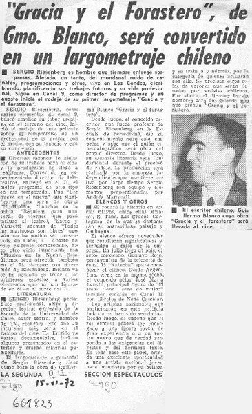 "Gracia y el forastero", de Gmo. Blanco, será convertido en un largometraje chileno. [artículo]