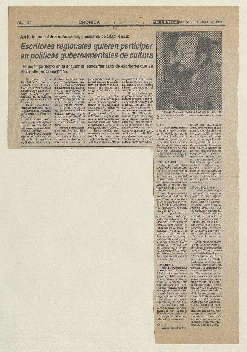 Escritores regionales quieren participar en políticas gubernamentales de cultura [artículo].