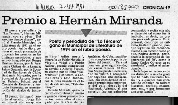 Premio a Hernán Miranda [artículo].