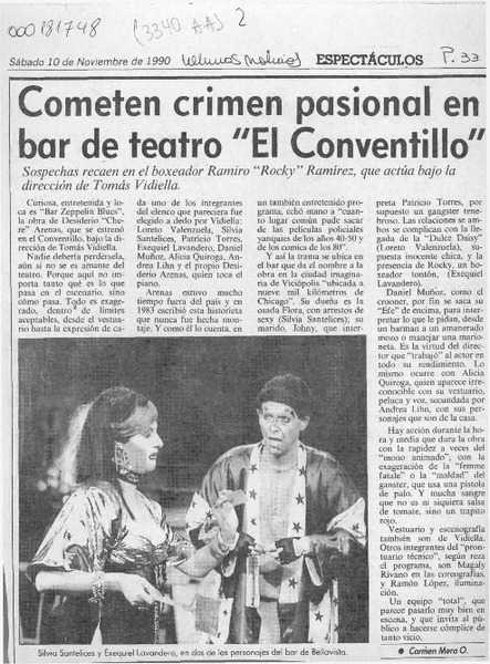 Cometen crimen pasional en bar de teatro "El Conventillo" [artículo] Carmen Mera O.