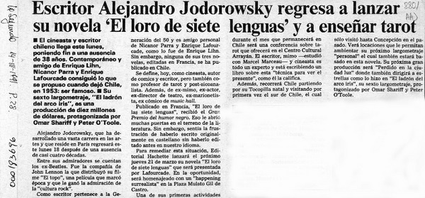 Escritor Alejandro Jodorowsky regresa a lanzar su novela "El Loro de siete lenguas" y a enseñar tarot [artículo].