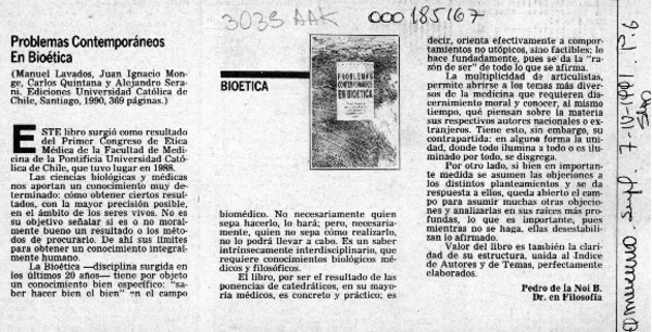 Problemas contemporáneos en bioética [artículo] Pedro de la Noi B.