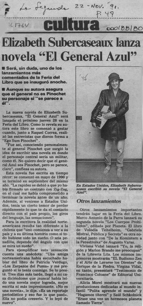 Elizabeth Subercaseaux lanza novela "El general azul" [artículo].