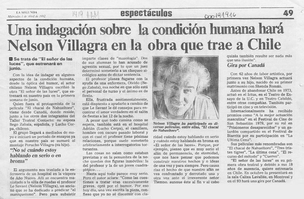 Una Indagación sobre la condición humana hará Nelson Villagra en la obra que trae a Chile [artículo].
