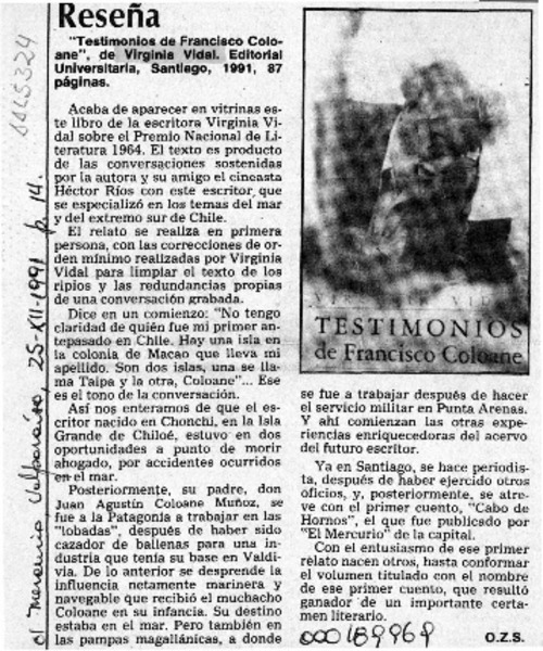 Testimonios de Francisco Coloane [artículo] O. Z. S.