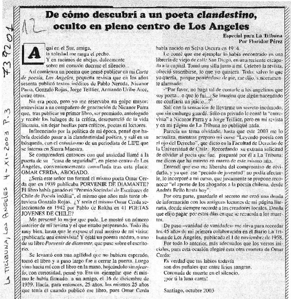 De cómo descubrí a un poeta clandestino, oculto en pleno centro de Los Angeles [artículo] Floridor Pérez.