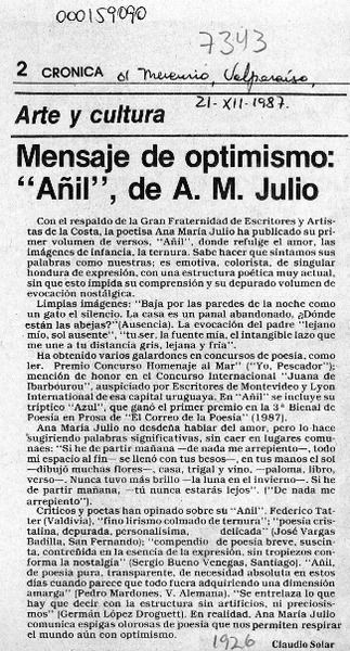 Mensaje de optimismo, "Añil", de A. M. Julio [artículo] Claudio Solar.