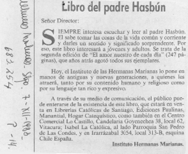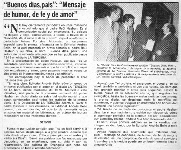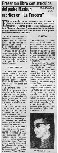 Presentan libro son artículos de padre Hasbún escritos en "La Tercera". [artículo]