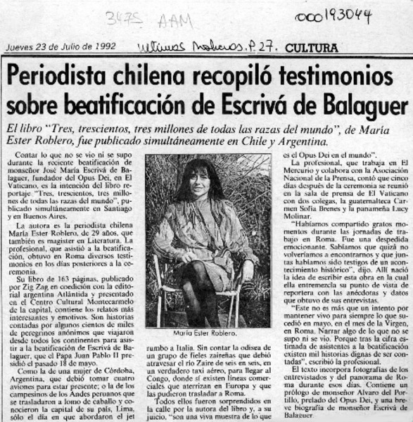 Periodista chilena recopiló testimonios sobre beatificación de Escrivá de Balaguer [artículo].