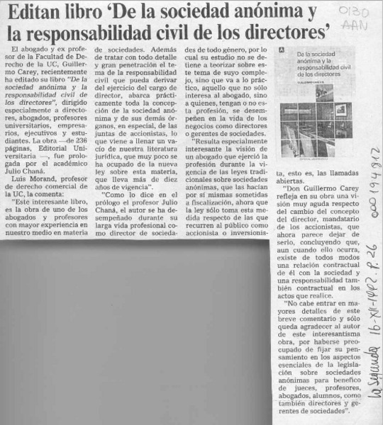 CAREY BUSTAMANTE, GUILLERMO - DE LA SOCIEDAD ANONIMA Y LA RESPONSABILIDAD CIVIL DE LOS DIRECTORES