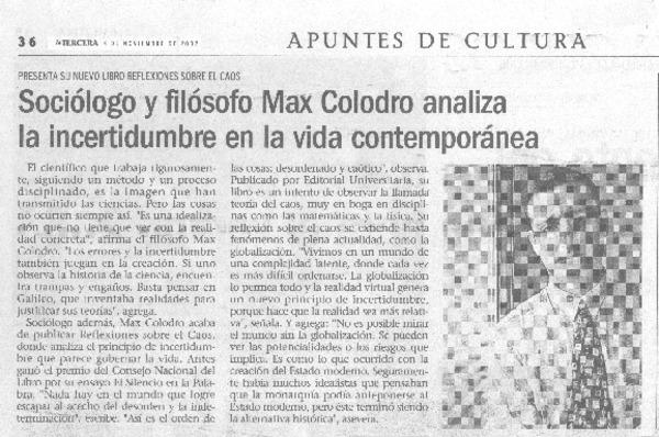 Sociólogo y filósofo Max Colodro analiza la incertidumbre en la vida contemporánea presenta su nuevo libro reflexiones sobre el caos. [artículo] :