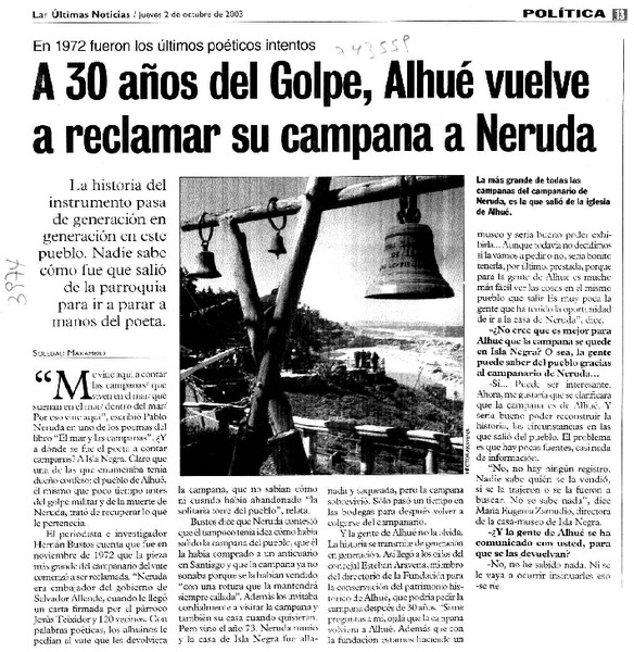 A 30 años del golpe, Alhué vuelve a reclamar su campana a Neruda [artículo] Soledad Marambio.