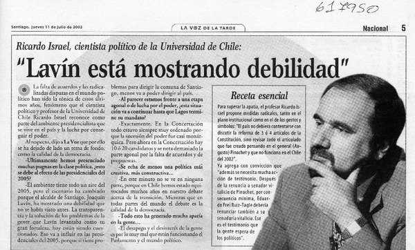 "Lavín está mostrando debilidad" [artículo] Solange Valladares U.