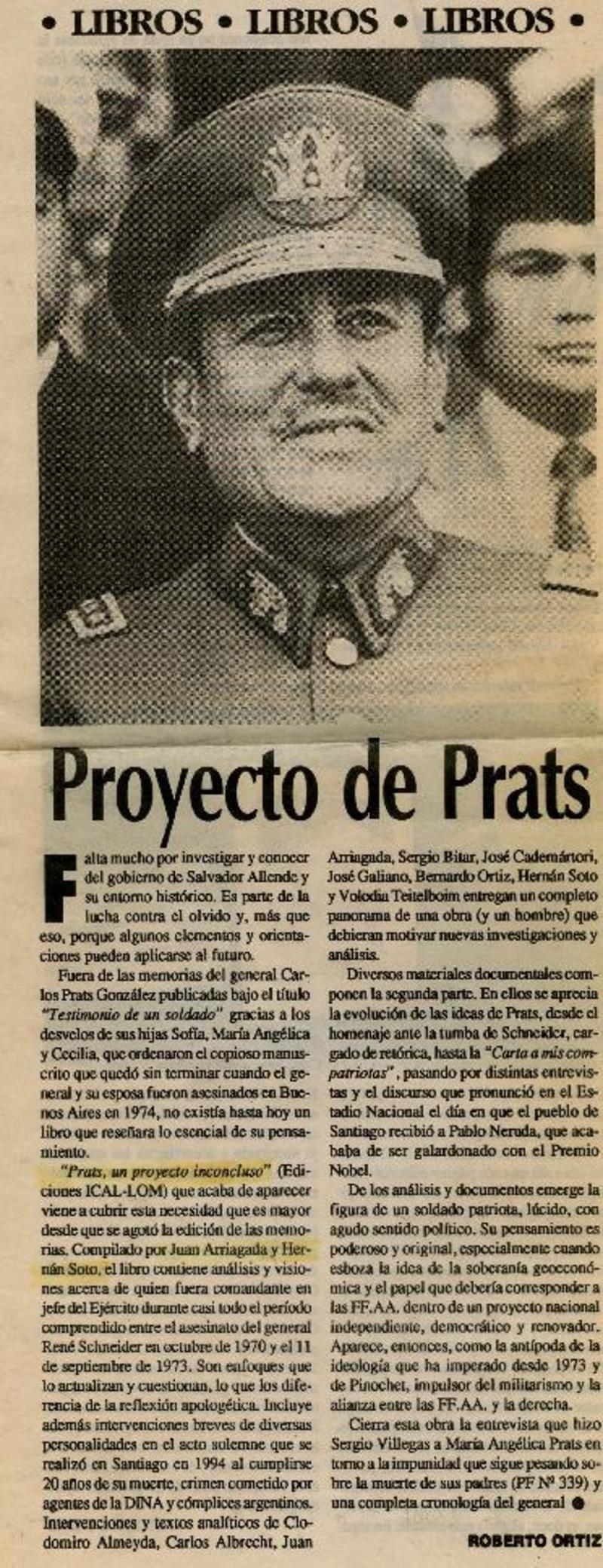 Autores chilenos - Teitelboim, Volodia - Bitar, Sergio - Prats González, Carlos - Cademártori, José - Memorias: Testimonio de un soldado - Soto, Hernán - Arriagada, Juan - Prats, un proyecto inconcluso - Ortíz, Bernardo