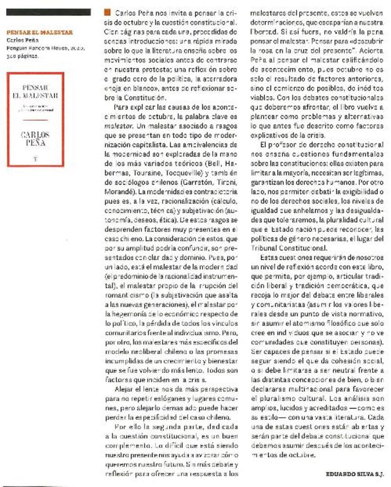 Pensar el malestar [artículo] Eduardo Silva S. J.