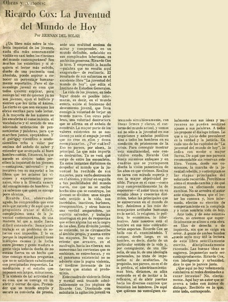 Ricardo Cox: la juventud del mundo de hoy [artículo] Hernán del Solar.