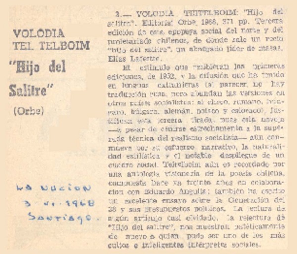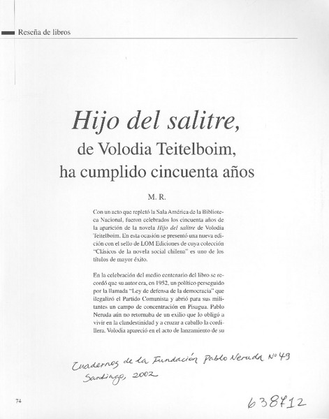 Hijo del salitre, de Volodia Teitelboim, ha cumplido cincuenta años [artículo] M. R.