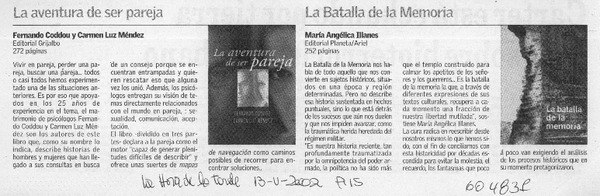 Autores chilenos - Coddou Placier, Fernando - Aventura de ser pareja, La - Méndez, Carmen Luz - Aventura de ser pareja - Illanes O., María Angélica - Batalla de la memoria