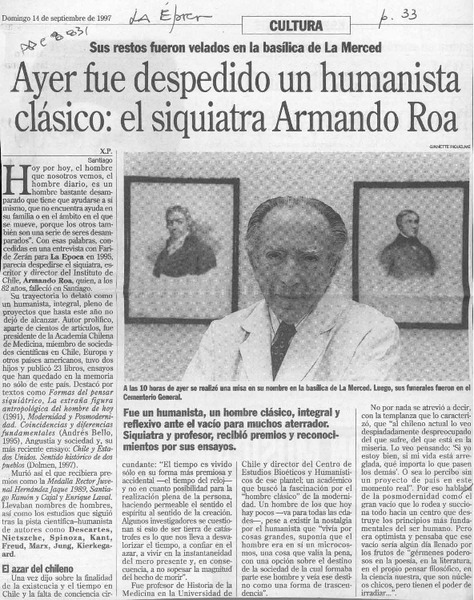 Ayer fue despedido un humanista clásico, el siquiatra Armando Roa [artículo] X. P.