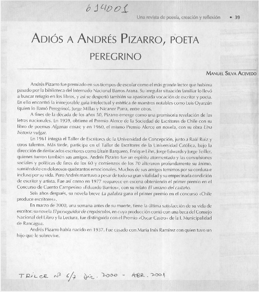 Adiós a Andrés Pizarro, poeta peregrino [artículo] Manuel Silva Acevedo