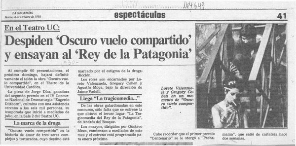 Despiden 'Oscuro vuelo compartido' y ensayan al 'Rey de la Patagonia' [artículo].