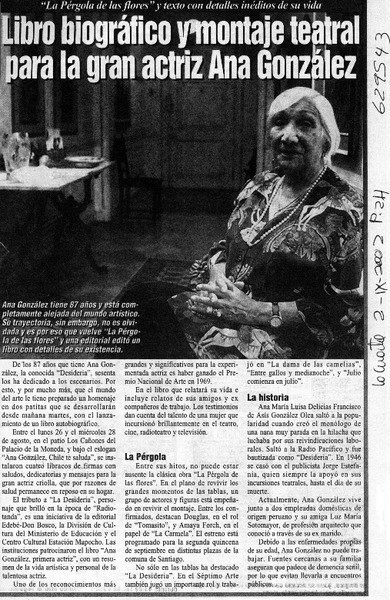 Libro biográfico y montaje teatral para la gran actríz Ana González [artículo].