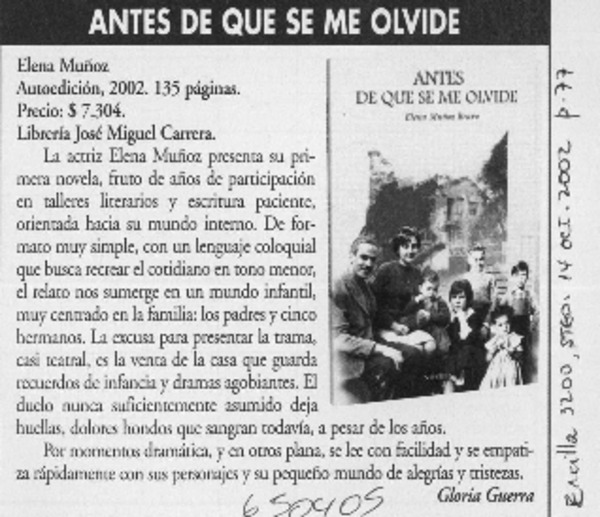 Antes de que se me olvide - Muñoz, Elena - Autores chilenos