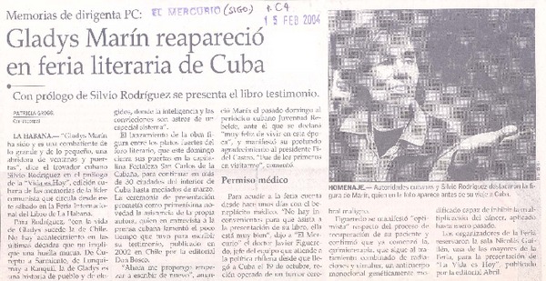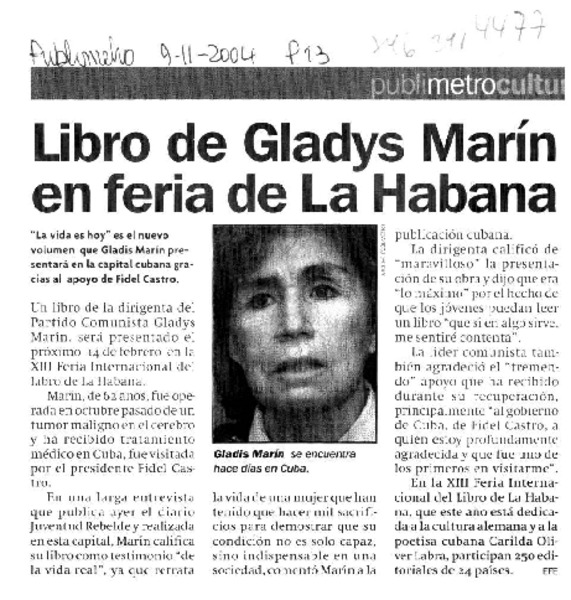 Gladys Marín reapareció en feria literaria de Cuba [artículo] Patricia Grogg.