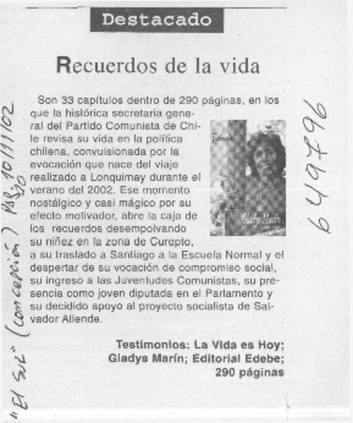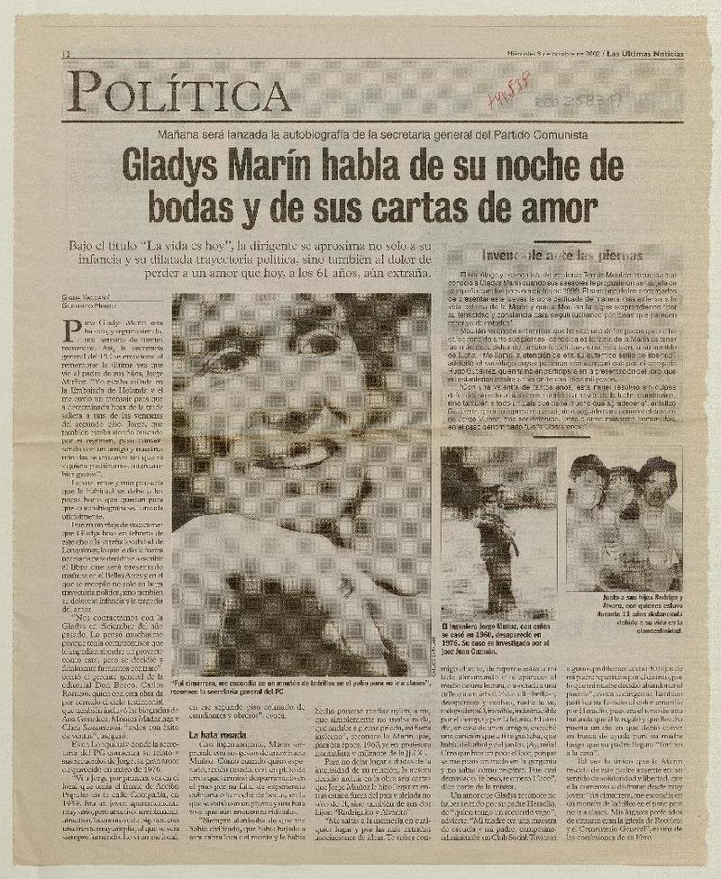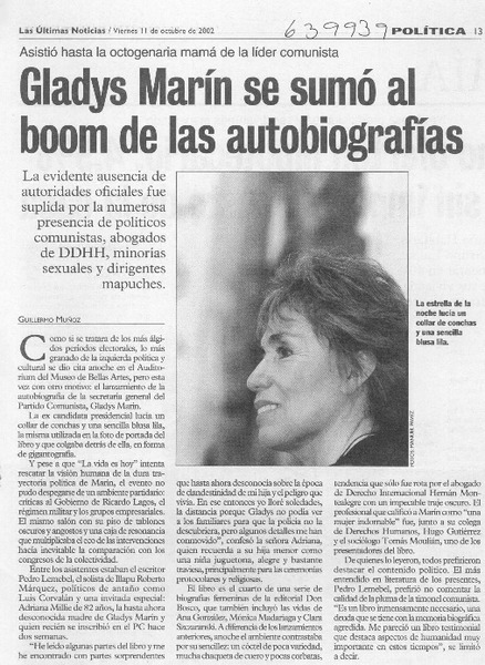 Gladys Marín habla de su noche de bodas y de sus cartas de amor mañana será lanzada la autobiografía de la secretaria general del Partido Comunista [artículo] : Giglia Vaccani [y] Guillermo Muñoz.