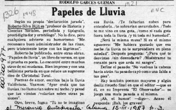 Papeles de lluvia [artículo] Rodolfo Garcés Guzmán.