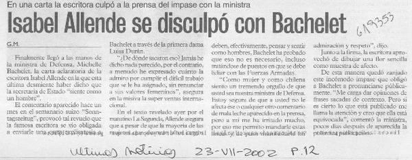 Isabel allende se disculpó con Bachelet [artículo] G. M.