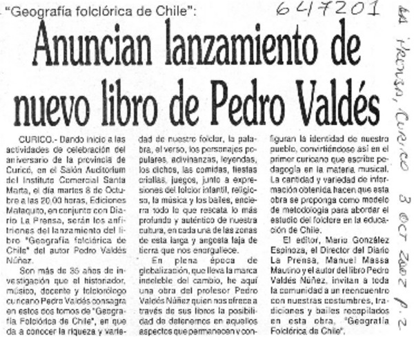 ![Anuncian lanzamiento de nuevo libro de Pedro Valdés [artículo] Anuncian lanzamiento de nuevo libro de Pedro Valdés [artículo]](channels-528_mime_jpg.gif)