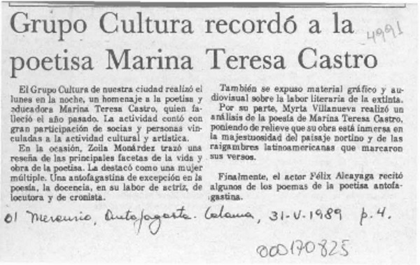 Grupo Cultura recordó a la poetisa Marina Teresa Castro [artículo].