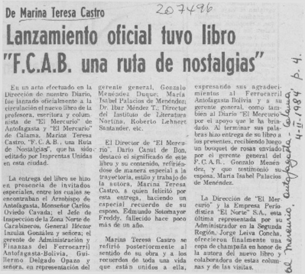 Autoras chilenas - Castro, Marina Teresa - "F.C.A.B. una ruta de nostalgia"