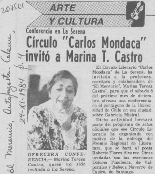 Círculo "Carlos Mondaca" invitó a Marina T. Castro [artículo].