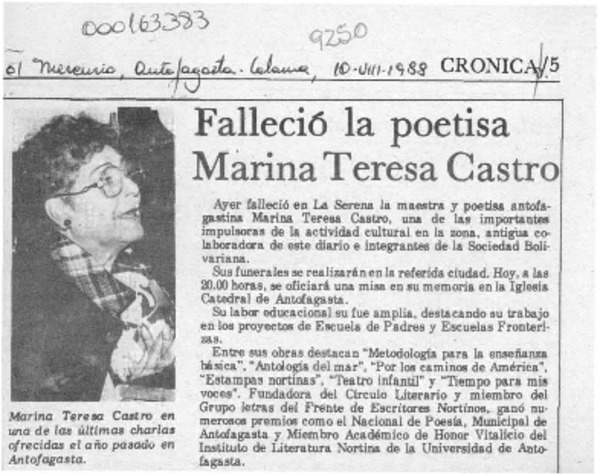 Falleció la poetisa Marina Teresa Castro [artículo].