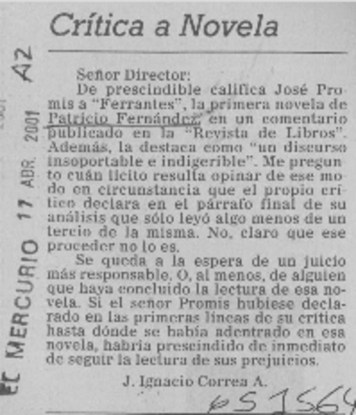 Crítica a novela [artículo] J. Ignacio Correa A.