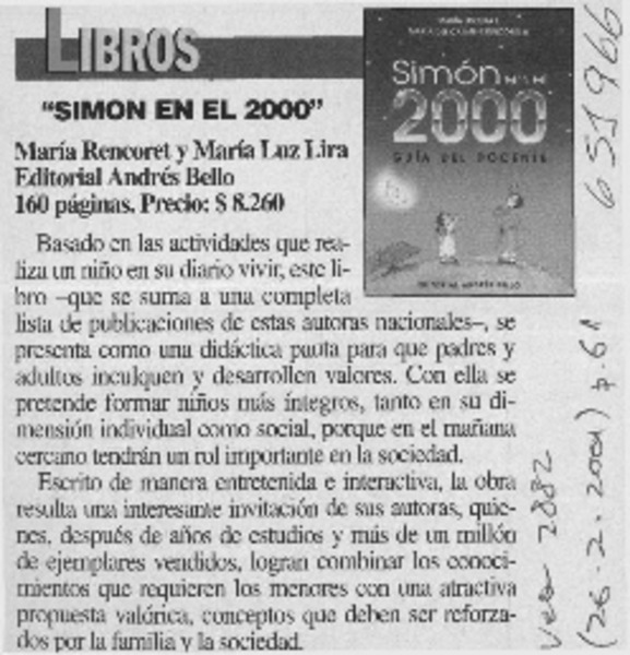 Autores chilenos - Rencoret Bustos, María del Carmen - Simón en el 2000 - Lira Larraín, María Luz