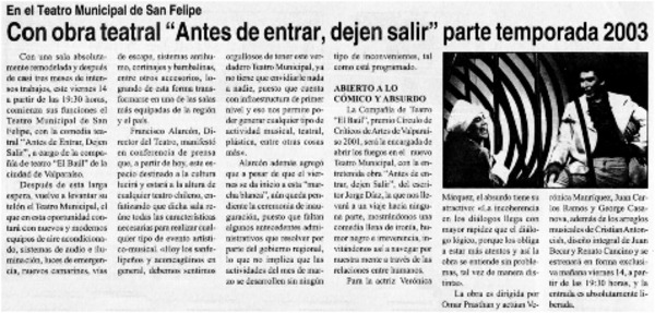 Con obra teatral "Antes de entrar, dejen salir" parte temporadea 2003. [artículo]