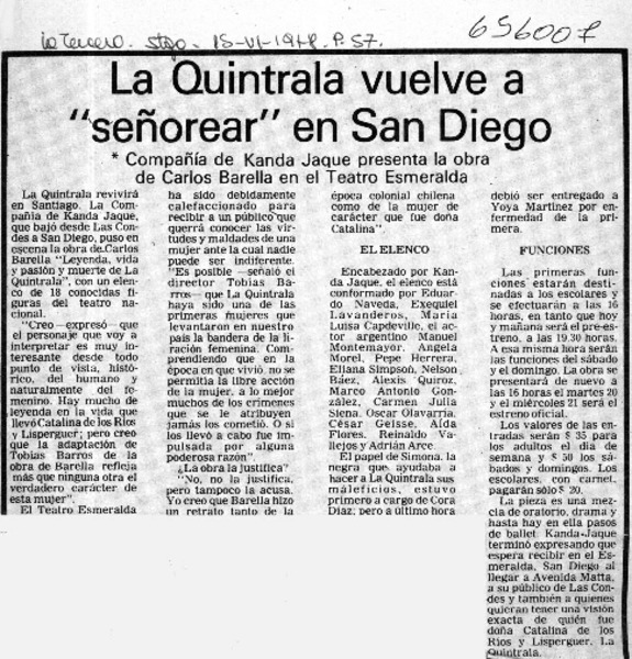 En el Teatro Esmeralda cuentan los pecados de La Quintrala. [artículo]