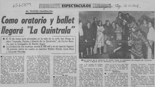 Como oratorio y ballet llegará "La Quintrala". [artículo]