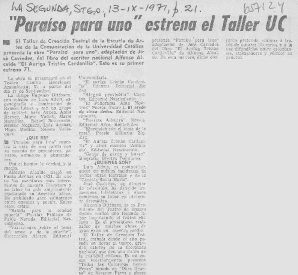"Paraíso para uno" estrenan actores del taller de la U. C. [artículo]