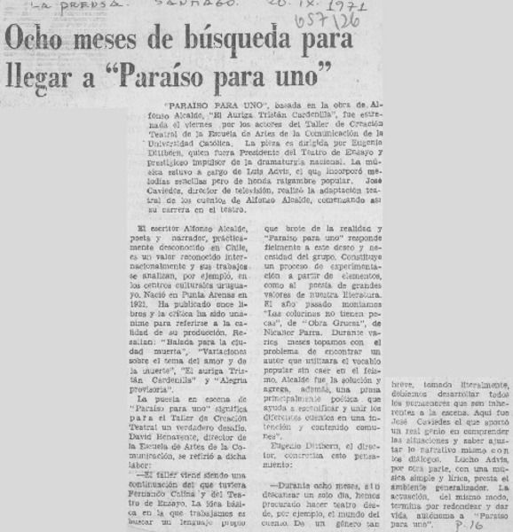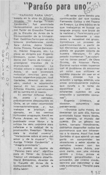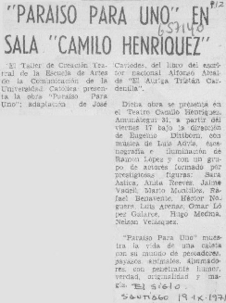 "Paraíso para uno" en sala "Camilo Henríquez". [artículo]