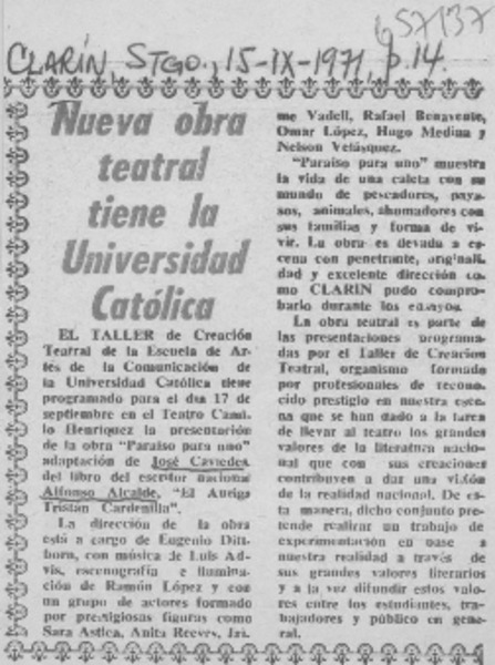 Nueva obra teatral tiene la Universidad Católica. [artículo]