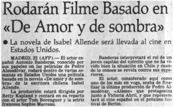 Rodarán filme basado en "De amor y de sombra" [artículo].