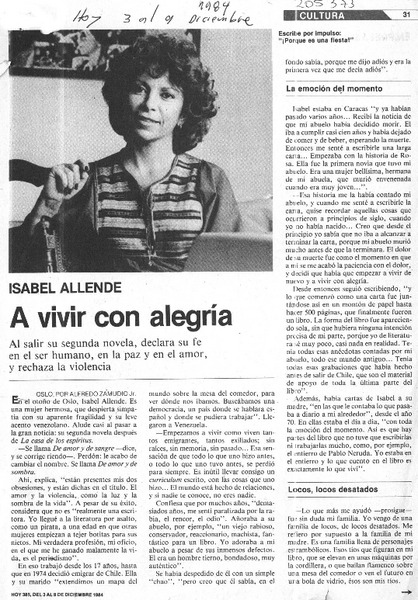 Isabel Allende asistirá a inauguración de villa que llevará su nombre [artículo] Por, Soledad Arce.