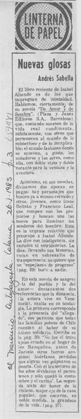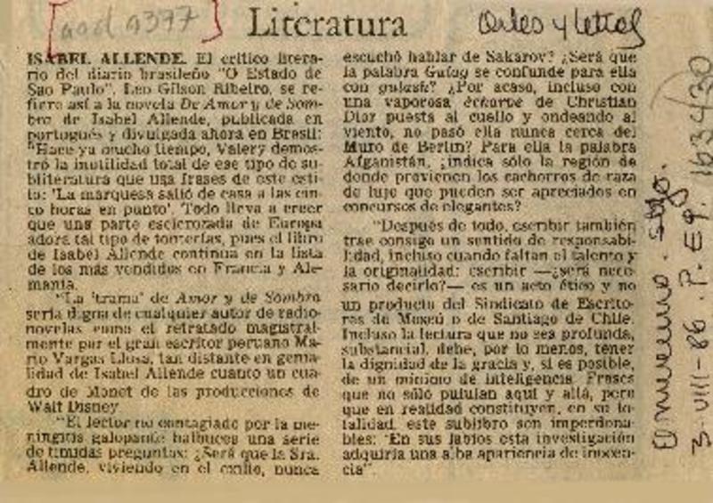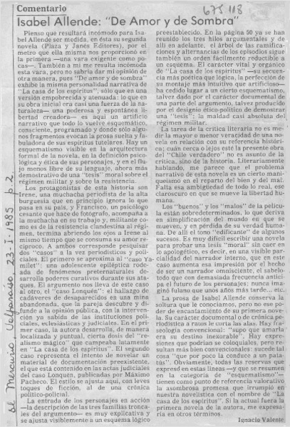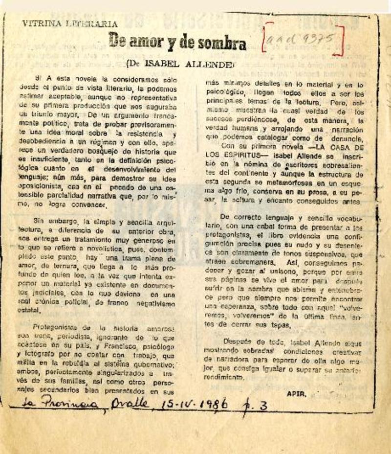 Isabel Allende, "de amor y de sombra" [artículo] Ignacio Valente.