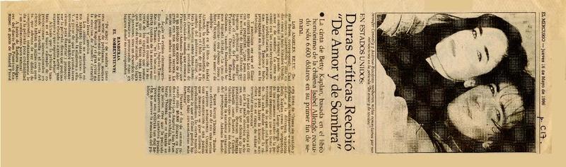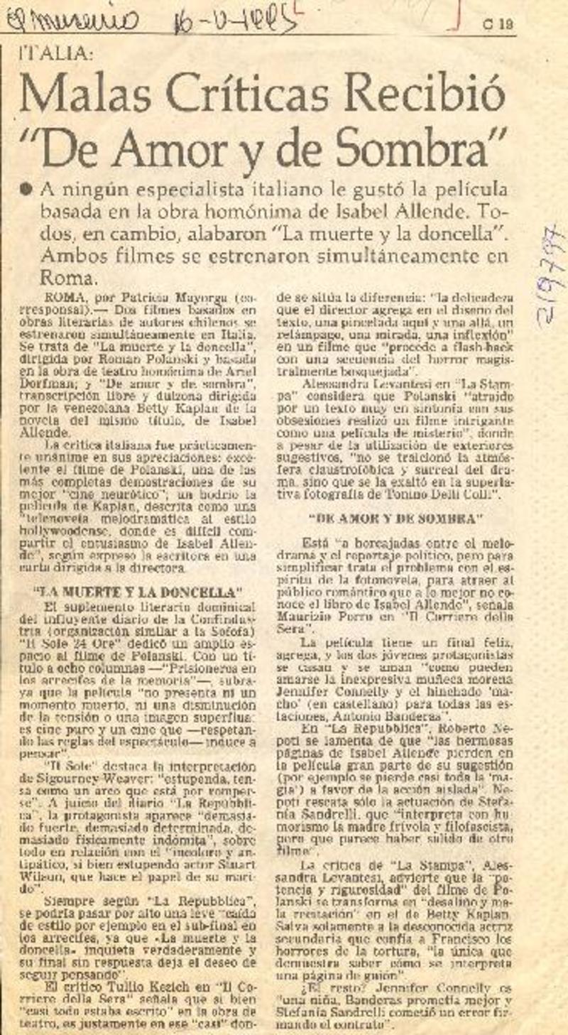 Malas críticas recibió "De amor y de sombra" [artículo].