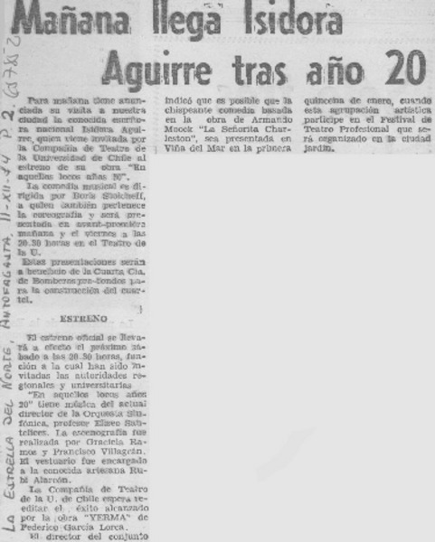 Mañana llega Isidora Aguirre tras año 20. [artículo]