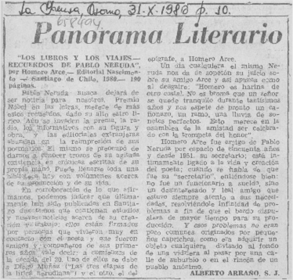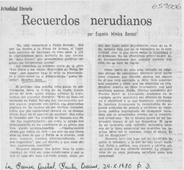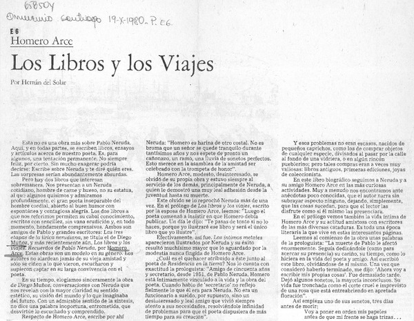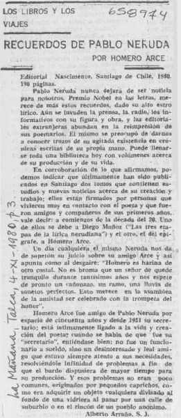 Homero Arce evoca a Neruda [artículo] Hugo Montes.